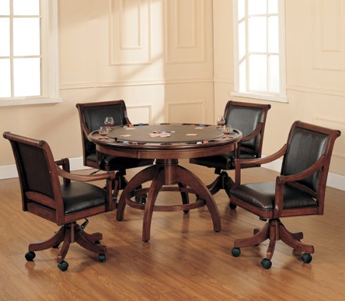 Add panche to your game room with Hillsdale Furniture's Palm Springs Game table and chairs. Finished in a medium brown cherry with brown leather seat cushions, this set combines comfort with casual living and functionality. With a transitional half sphere base and a clean rectangle chair back chair with arms, this multi-function table offers a dining surface on one side, a leather topped game surface on the other, as well as storage, checkers and backgammon game surfaces underneath the top. Composed of solid woods, climate controlled wood composites, and veneers, this ensemble can find a home in your game room, den, or kitchen. Complete your game room décor with the matching bistro table and barstools.Offers Storagecheckers and backgammon game surfaces underneath the topComposed of solid woodsAssembly Required Medium AssemblyFabric LeatherFinish Dark WoodColor BrownStyle TransitionalShape Round