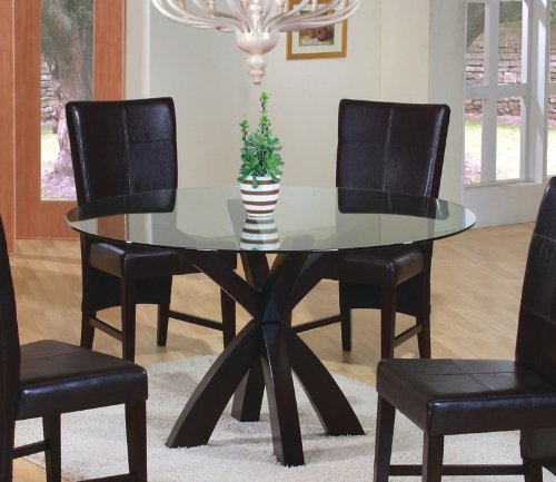 "This round glass dining table has a criss cross design in a modern dark cappuccino finish. The glass table top has smooth, beveled edges and comes in a standard 48 ...